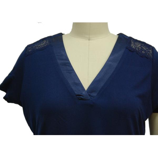 Ladies Casual V Neck Shirt short Sleeves 65%viscoses35%cotton, Front neckline with satin,shoulder with lace